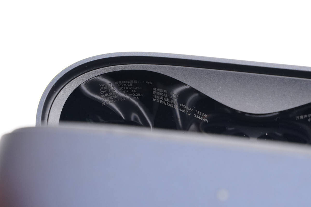 充電盒蓋內(nèi)側(cè)印刷信息有xiaomi真無線降噪耳機(jī)Pro,產(chǎn)品型號(hào):M2103E1,CMIIT ID:2021DP836,充電盒輸入:5V-1A,充電盒輸出:5V-0.25A,耳機(jī)輸入:5V-0.12A,電池型號(hào):BW50,標(biāo)稱電壓:3.8V,充電盒電池容量:480mAh/1.82Wh,單耳機(jī)電池容量:38mAh/0.144Wh。