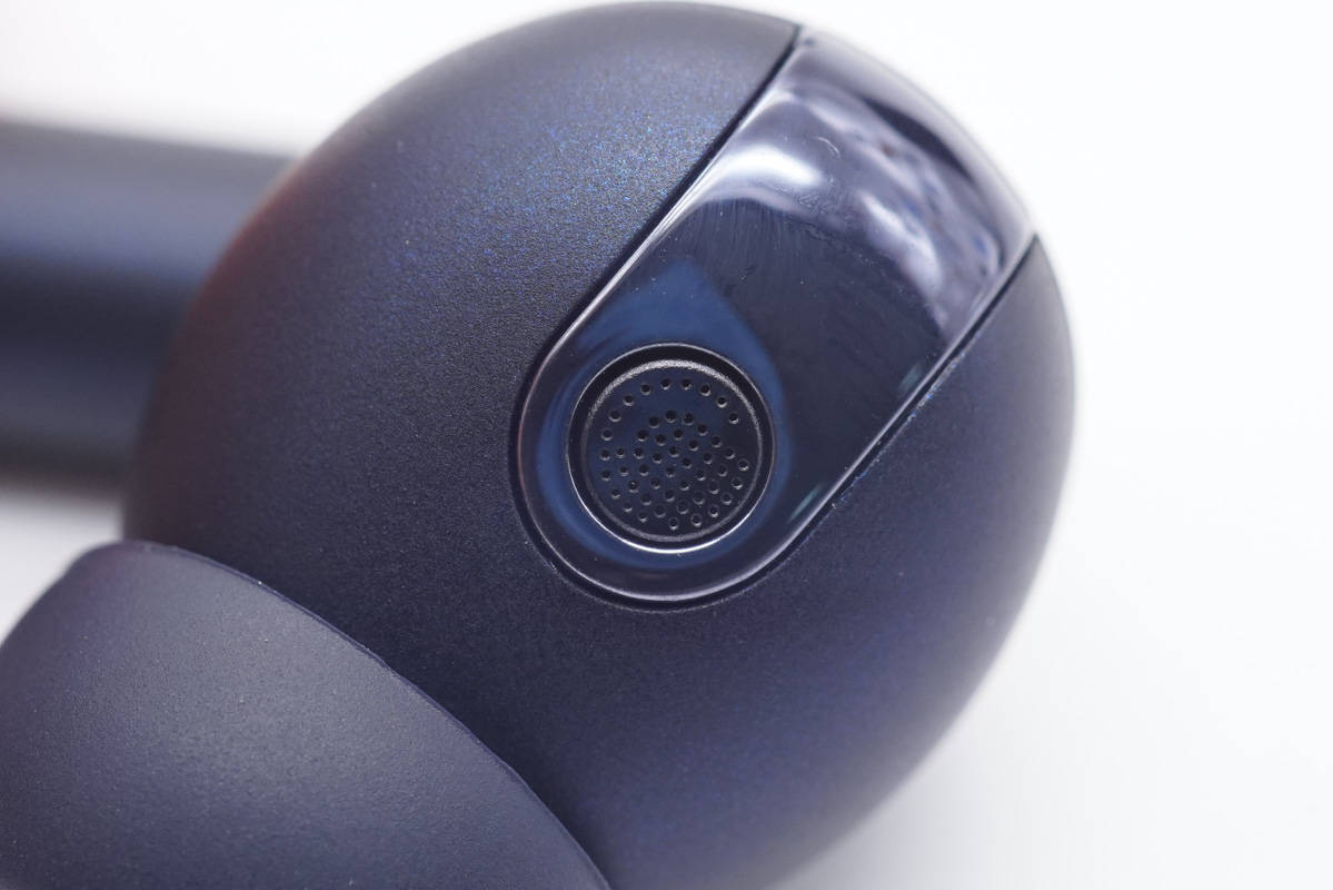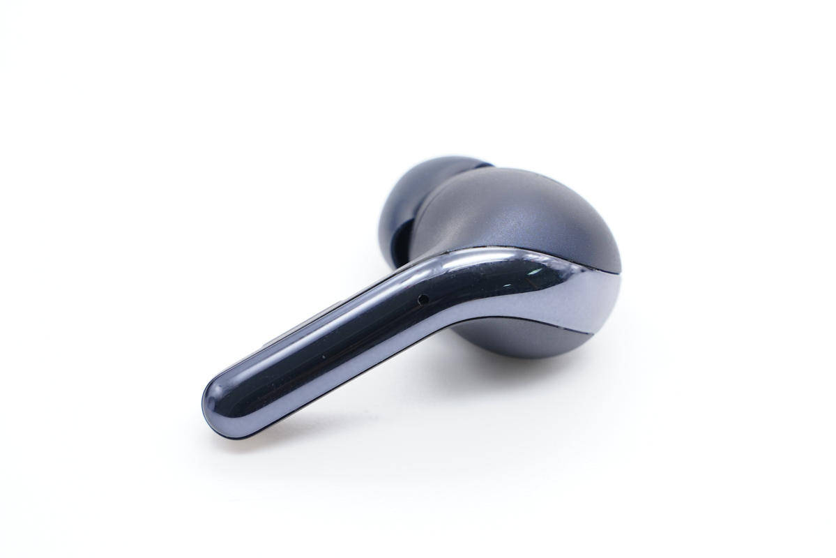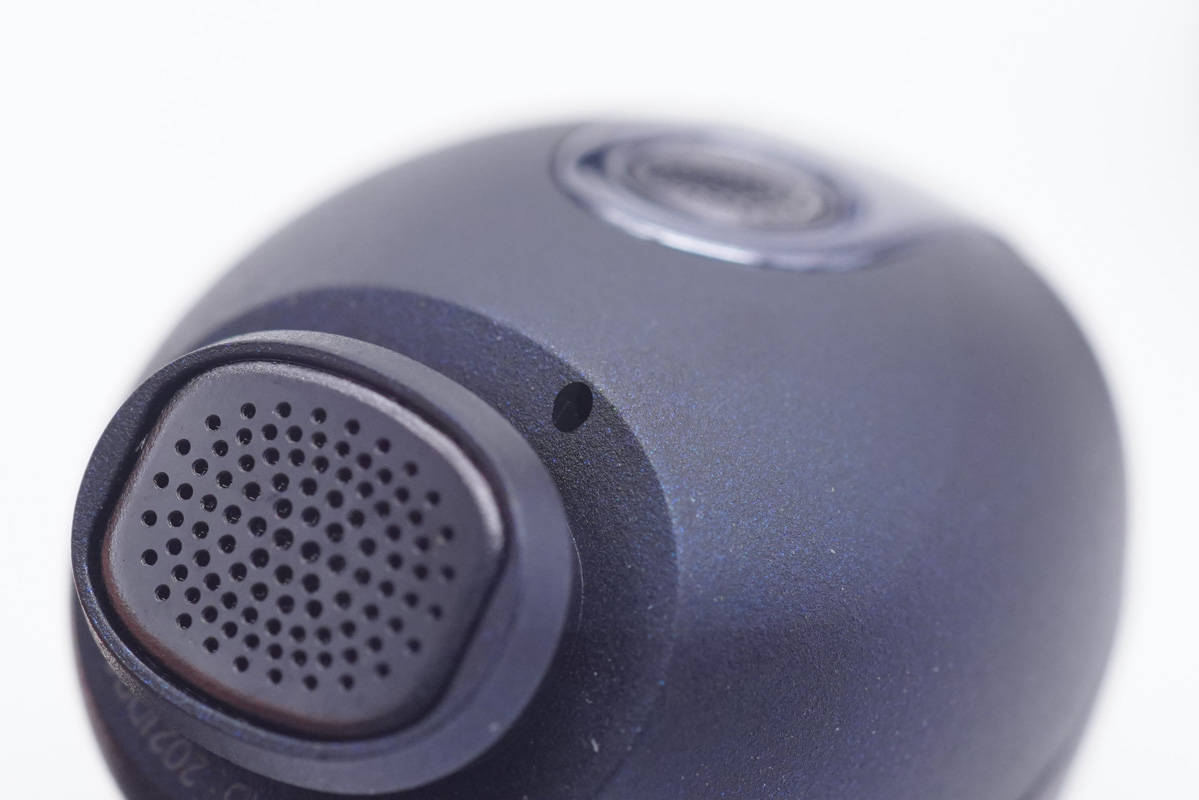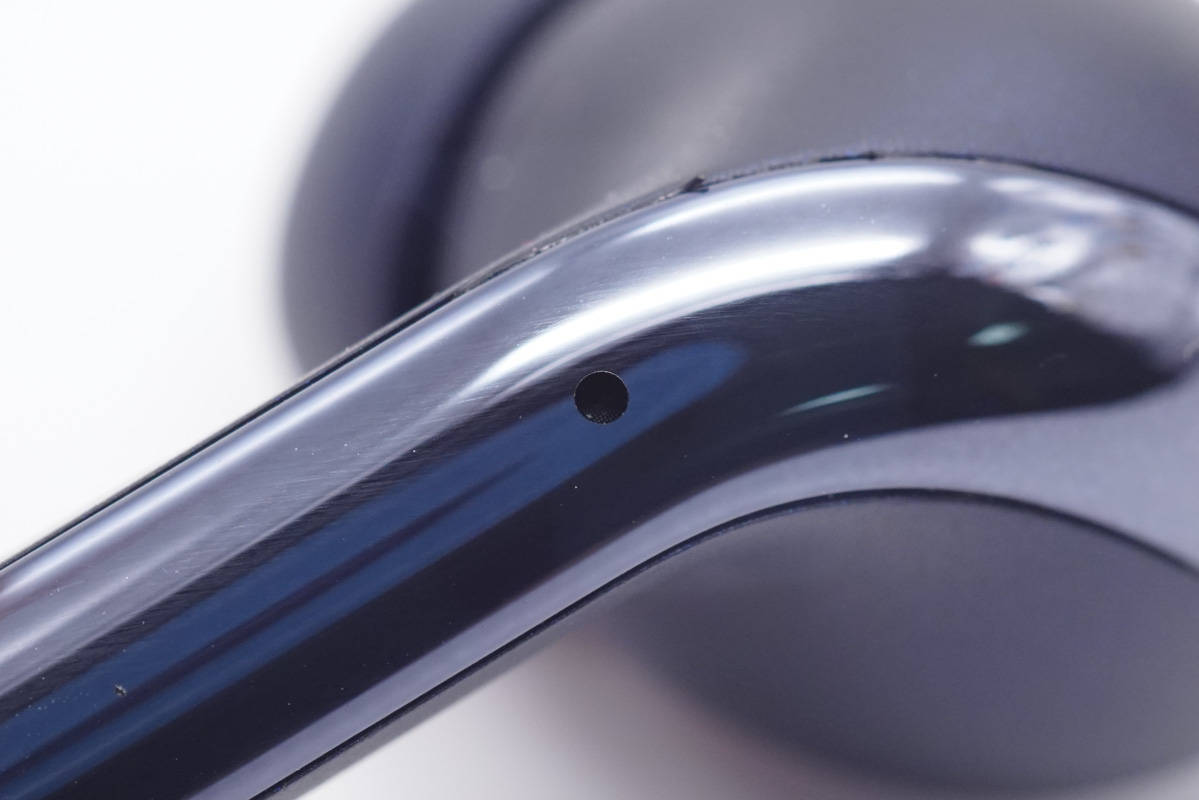 耳機(jī)柄頂部有一顆圓形降噪麥克風(fēng)開孔。