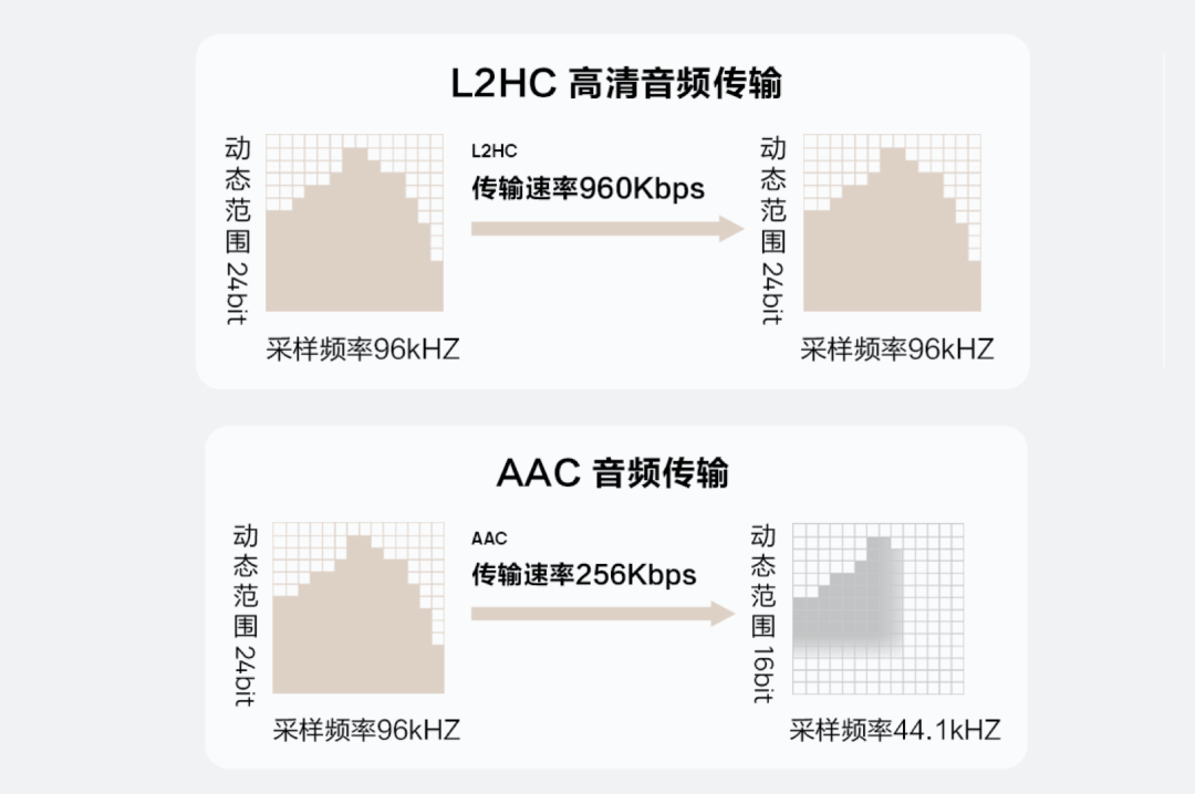 L2HC 仍然歸屬于 HWA,是華為自研自有專利無(wú)線音頻編解碼格式,能夠?qū)崿F(xiàn)最高 960kbps 音頻傳輸速率。支持音質(zhì)優(yōu)先和流暢優(yōu)先,兩種可聽(tīng)模式。前者使用的是高清藍(lán)牙編解碼器,高寬帶和自適應(yīng)碼率。后者則在藍(lán)牙狀態(tài)不佳時(shí),會(huì)自動(dòng)調(diào)節(jié)至低碼率,保證音樂(lè)播放的流暢度。