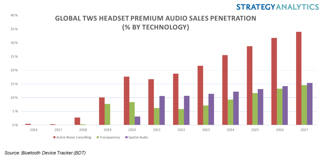 據(jù)市場(chǎng)調(diào)研機(jī)構(gòu) Strategy Analytics 的報(bào)告預(yù)計(jì),2022 年全球 TWS 耳機(jī)出貨量將同比增長(zhǎng) 38%。音頻質(zhì)量,尤其是主動(dòng)降噪、透明模式和空間音頻是最受歡迎的特性。防水和無(wú)線充電功能也十分受歡迎。特色差異化是廠商在日益擁擠的細(xì)分市場(chǎng)中脫穎而出的關(guān)鍵。