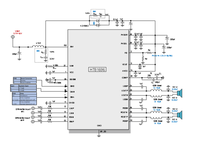 此外,HT81696內(nèi)部集成免濾波器調制技術,能夠直接驅動揚聲器,內(nèi)置的關斷功能使待機電流最小化,還集成了輸出端過流保護、片內(nèi)過溫保護、輸入電源欠壓異常保護、升壓電壓過壓保護等功能。