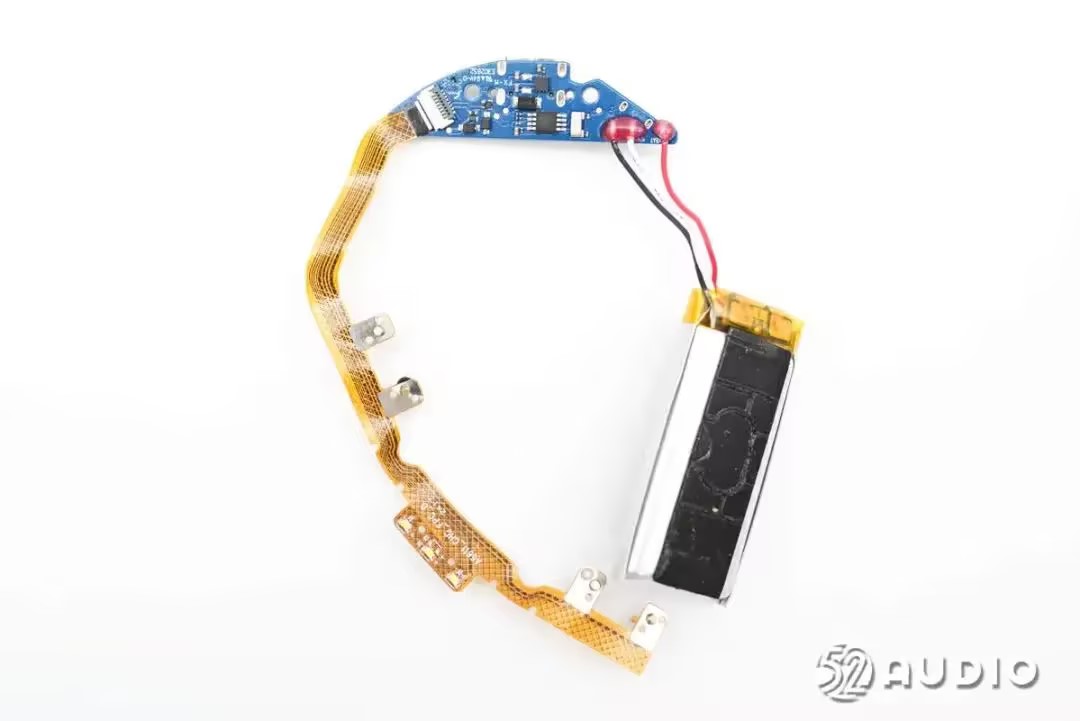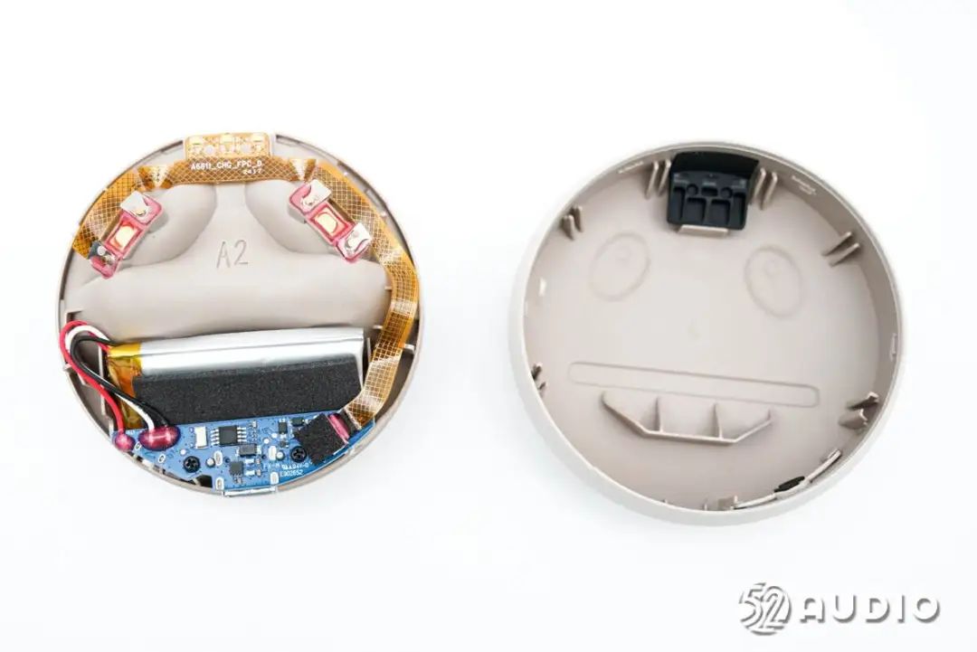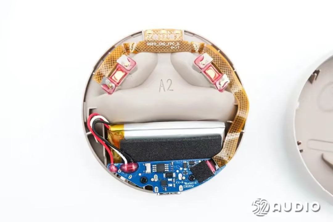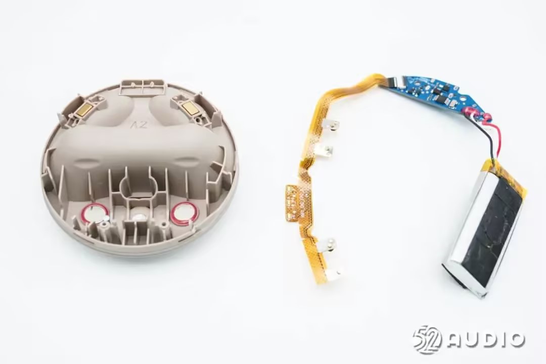座艙底部結(jié)構(gòu)一覽,設(shè)置有主板、電池和為耳機充電的FPC排線。
