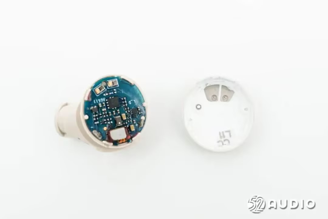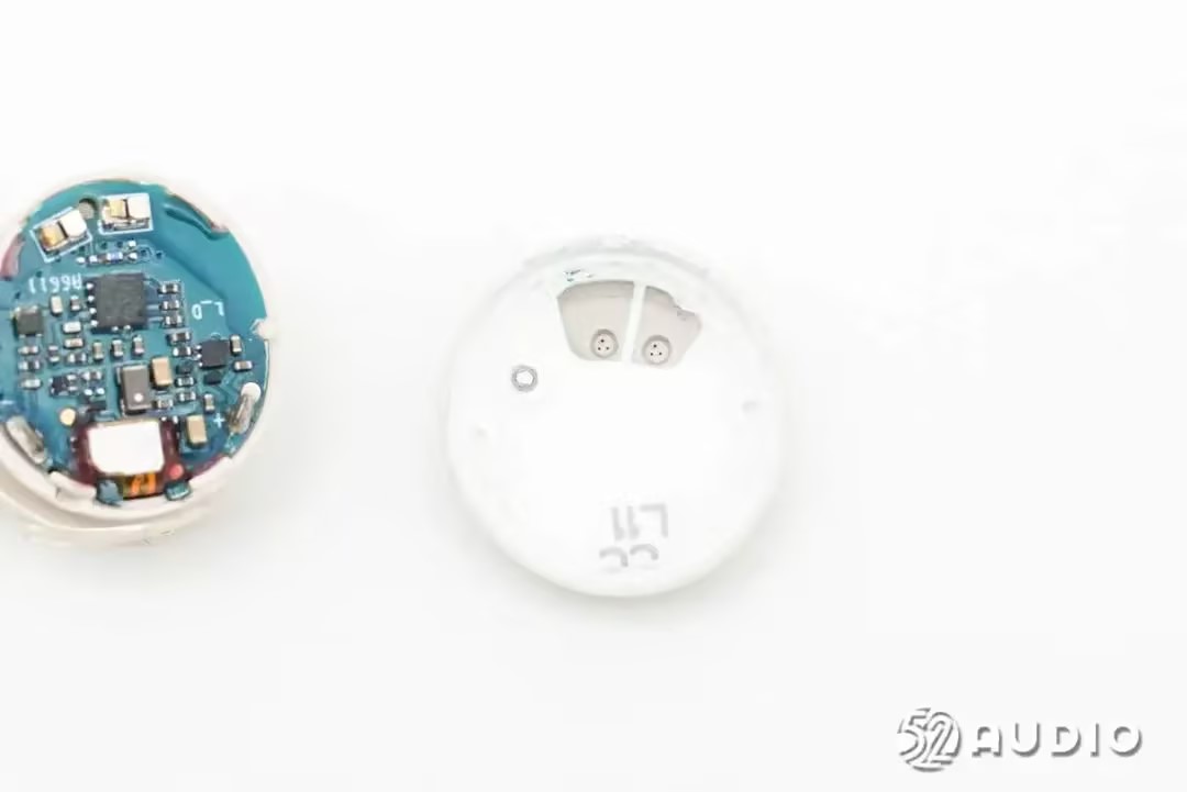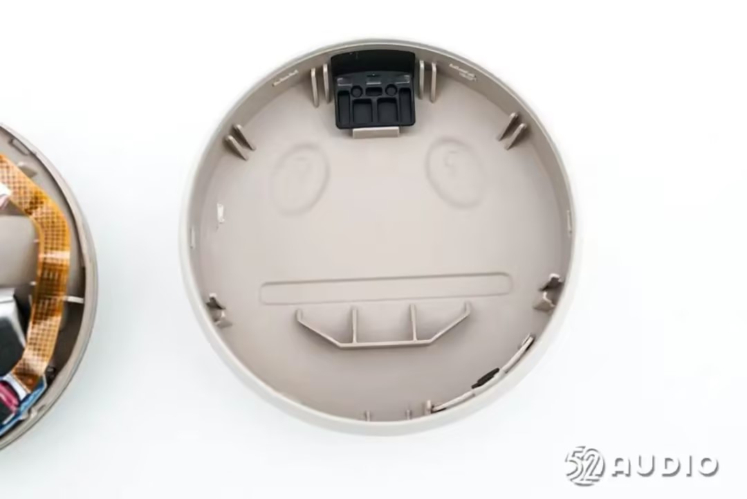 座艙底部結(jié)構(gòu)一覽,上方兩顆方形磁鐵固定耳機,下方兩顆圓形磁鐵為滑動盒蓋提供阻尼感。