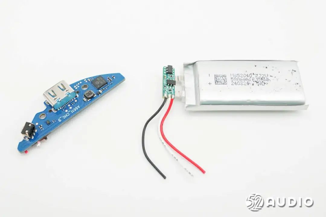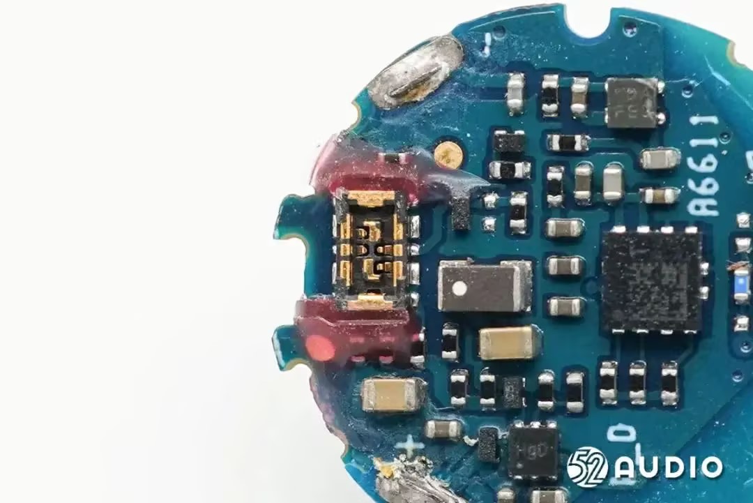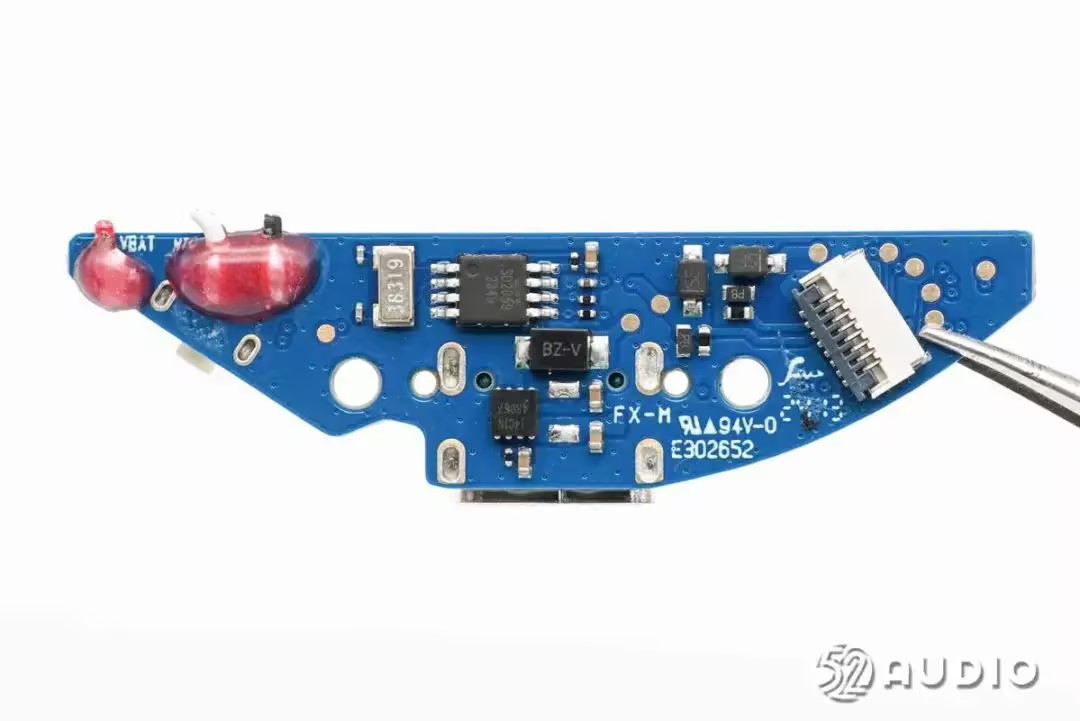 充電盒內(nèi)部主要電路一覽,排線與主板通過ZIF連接器連接,電池導線與主板焊接。
