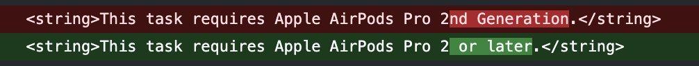 舊版代碼中,某任務(wù)描述需要“AirPods Pro 第二代”,而在最新版軟件中,這-描述改為“AirPods Pro 2 或更高版本”
